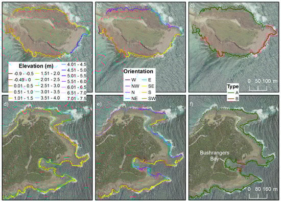 Figure 8 was created to highlight the point above. The maps show a comparison of mean elevation, orientation and type for individual segments presented in this study (full lines) using UAV data, and for segments analysed by [] using LiDAR data (dashed line). One thing that clearly stands out is the difference in the definition of the seaward edge. At Windang Island (a, b and c), the seaward edge derived by LiDAR was located further out than the one delimited from the UAV data for large parts of the platform, whereas at Bass Point (d, e and f), edge delimitation was mostly the same, apart from the northeastern part of the platform that showed a large disparity between surveys, probably as a result of classification issues performed by the contractor. Given that the LiDAR metadata file indicates that 37 flight runs were needed over 16 days to capture the Kiama dataset (which extends for approximately 600 km2 in both the westerly and southerly directions), conjectures about tidal levels are difficult to formulate.