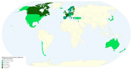 Figure 1 shows the countries on a world map classified according to the number of criteria found in their legislation. Only 2 countries had 4–5 criteria, 13 had 6–7 criteria, 12 had 8–9 criteria, 6 had 10–11, and only 2 countries had 12 criteria.