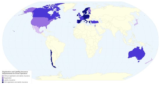 Former studies limited their results to specific countries or groups of countries, or presented the use of drones for commercial purposes, without specific analysis of the relevant legislation. For example, Cracknell [] presented an analysis on the legislation of drone use in Australia, USA, other countries (UK and China), and the EU. Cunliffe et al. [] analyzed the safe growth of lightweight drones in UK, whereas Chamoso et al. [] discussed the use of drones in Spain with reference to Spanish and European legislation. To the best of our knowledge, this is the first time that the legislative framework for the use of drones in so many countries is examined, highlighting major similarities and differences.