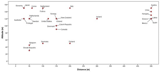 Another flight restriction is the maximum distance from the operator, which varied from 30 to 500 m. Australia, Belgium, Estonia, Israel, Japan, Korea, the Netherlands, Poland, Portugal, Slovakia, Slovenia, Sweden, and Turkey had strict regulations on the horizontal distance between the operator and the vehicle (flying drone), contrary to the rest of the countries, where the horizontal distance between the operator and the vehicle was about 100–500 m. The combinations of altitude and horizontal distance limitations per country are presented in Figure 3.