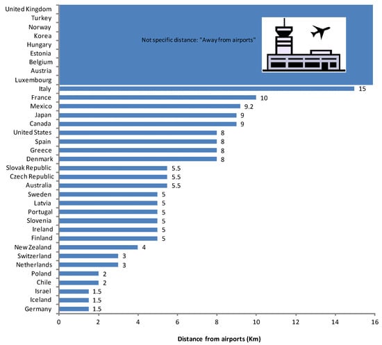 All OECD countries had restrictions for flights near airports, populated areas, and buildings or authorities. While most of the countries have legislated a minimum distance away from airports, Austria, Italy, Korea, Turkey, the UK, Hungary, Estonia, Belgium, and Luxemburg have not determined a specific distance, rather than requiring a “safety distance” (Figure 4).