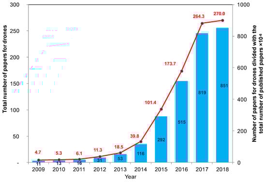 To justify the increased interest for drone applications, we ran a search in the Scopus database (as for June 2019) using the keywords “drones” and “unmanned aerial vehicles” between 2009 and 2018. Our research resulted in 2717 published journal papers, as shown in Figure 5. There was an increasing trend, from 11 papers published in 2009 to 851 published in 2018. We also show the ratio of drone-related papers to the total number of papers published per year in the Scopus database, which also followed an ascending trend, from 4.7 × 10−6 in 2009 to 270.0 × 10−6 in 2018.