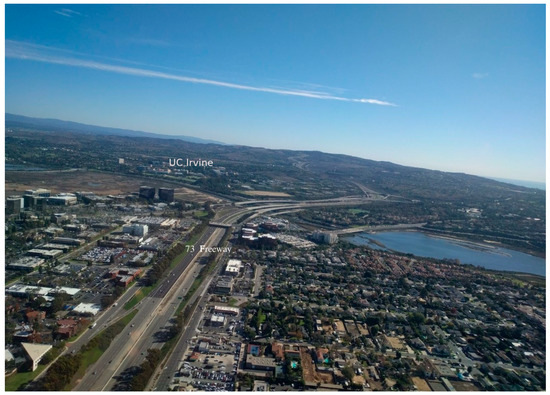 View to the south on takeoff from KSNA RWY 20R. UC Irvine is visible past the open marsh area clearly visible beyond the two black cube-shaped buildings, on the left side of the 73 freeway in the distance. It is unclear how any manned aircraft would be expected to be below 500′ AGL over UC Irvine, since it is so far out of the traffic pattern and over 2 miles out perpendicular to the KSNA runways. The data supports this. Therefore, the zero-foot grid categorization there for SUAS activity is a mystery.