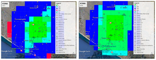 The number of flights tracked in 2018 vs. 2019 globally by the aggregator “adsbexchange” was different by about two times, presumably because more volunteers were added to the network during that period. The KSNA overall amount of data showed a similar trend, and thus increased point density in the 2019 vs. 2018 plots is probably not indicative of increased traffic overall.