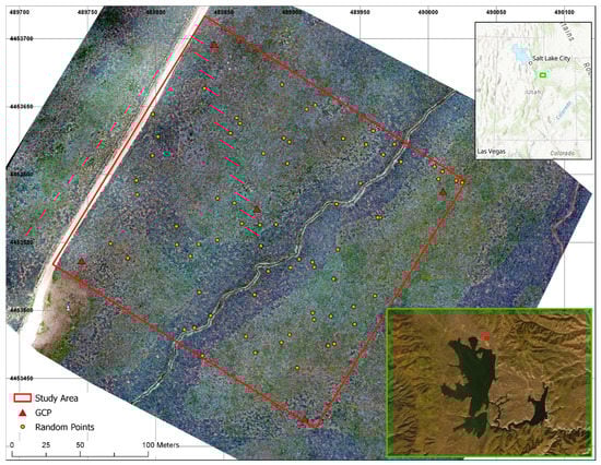 We acquired imagery on a 5.75 ha plot near Trout Creek, Utah, located east of the Wasatch Mountains and south of the Uinta Mountains in east-central Utah (40.232107° N, 111.118933° W, Figure 1). The dominant feature near the study area is the Strawberry Reservoir, which covers approximately 2500 ha. The terrain within the study area is relatively flat with a mean elevation of approximately 2350 m. Mean annual precipitation is 79 cm [34], with cool summers (13.5 °C mean air temperature) and cold winters (−8.7 °C mean air temperature). Mountain big sagebrush (Artemisia tridentata spp. vaseyana) is a tall, amorphous, typically flat-topped shrub that generally does not exceed 180 cm in height, but may exceed 240 cm in height [35,36], and is the dominant shrub with a rich diversity of intercanopy grasses and forbs (Figure 2).