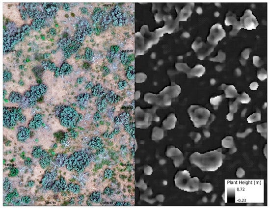 Comparison of RGB imagery (left) with a plant height layer, derived from subtracting the Digital Terrain Model (DTM) from the Digital Surface Model (DSM, right) acquired using a DJI Mavic Pro 2 quadcopter at 75 m above ground level (AGL) near Strawberry Reservoir, Utah, USA.