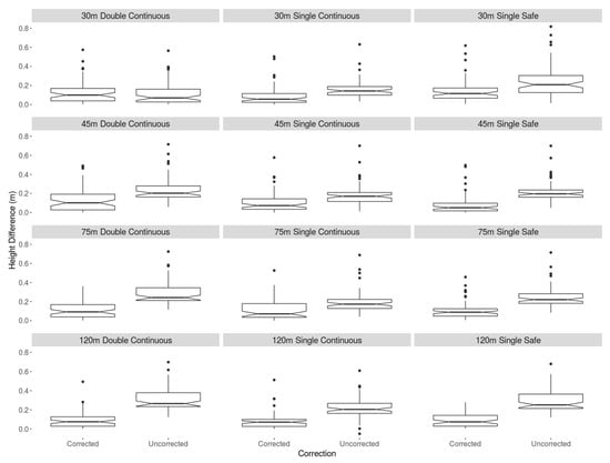 Absolute value of differences between true height and measured height (m), for both uncorrected (right plot) and corrected using linear regression (left plot) for each flight parameter combination (by height, single or double pass, and continuous or safe mode).