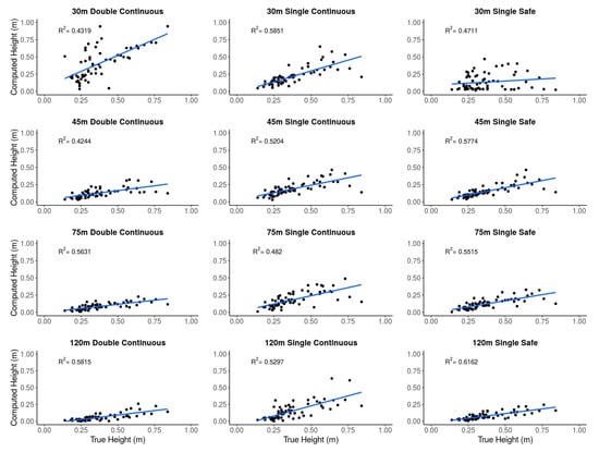 Regression plots for each flight parameter combination (by height, single or double pass, and continuous or safe mode) comparing true height in meters (x-axis) and computed height in meters (y-axis).