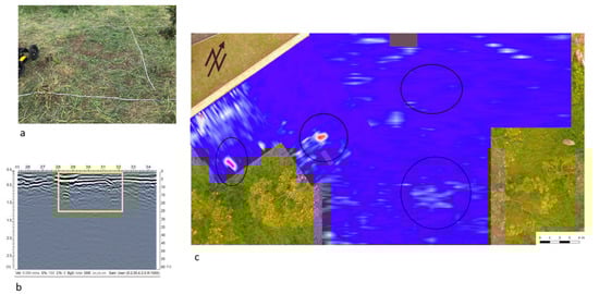 (a) shows the GPR acquisition on the top of one of the anomaly detected by the drone; (b) is a radargram showing clearly the presence of a dig backfilled with something inside (the yellow rectangle); (c) illustrates the depth slice (at 0.40 m) with the two clear anomalies related to the possible clandestine graves of the missing people (the black circles are the locations of the 4 anomalies detected by the drone, see Figure 1).