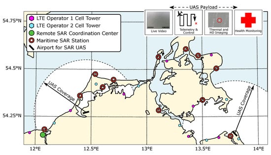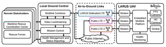 - Güldenring, J.; Koring, L.; Gorczak, P.; Wietfeld, C. Heterogeneous Multilink Aggregation for Reliable UAV Communication in Maritime Search and Rescue Missions. In Proceedings of the 15th IEEE International Conference on Wireless and Mobile Computing, Networking and Communications (WiMob 2019)–Sixth International Workshop on ICT Systems for Public Protection and Risk Reduction–2019 (ICT4PPRR’19), Barcelona, Spain, 21 October 2019; IEEE: Piscataway, NJ, USA, 2019. [Google Scholar]