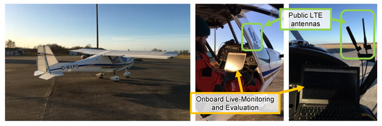 During the UAV experiments, the video stream was used to navigate and monitor the vehicle. Maxing out the communication link’s performance would have interfered with the video streaming. Therefore, an additional manned flight was conducted to assess the maximum key performance indicators of the system. The plane for the manned flight is illustrated in Figure 6. An ultra-lightweight plane was used for those experiments. The same hardware (antennas and multi-link platform) being used in the UAV experiments was also used during the manned flight to create comparable results. Due to the unavailability of space in the back, the antennas were placed at the front window of the plane, which is contrary to the UAV experiments.