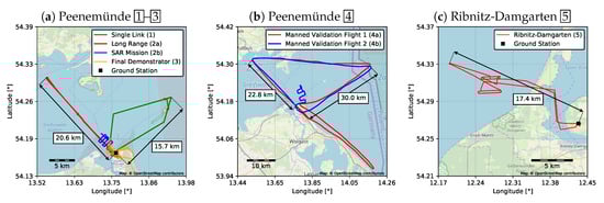 In the first evaluation area, the UAS was launched at Peenemünde airport (ICAO airport code EDCP). The trajectory of the flight is depicted in Figure 7a. Several flights originated from this location. The first data set