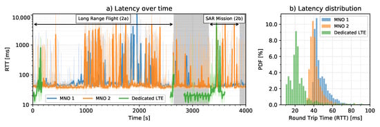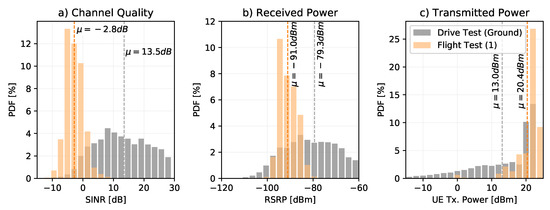to a ground reference measurement. For channel quality, the UE-estimated Signal-to-Interference-plus-Noise Ratio (SINR) is analyzed. The received power is presented in form of the Reference Signal Received Power (RSRP). An estimate of the UE’s power consumption is provided by the Transmission Power. The ground reference measurement was recorded during a drive test in a car on a German highway. The reference measurement uses the same LTE modem, antennas, and MNOs that were used in the aerial measurement campaign. The resulting figure shows the value distribution of each indicator incorporated by the Probability Density Function (PDF). For the aerial test, the SINR ranges from to 5 dB with an average of dB. The ground test results in a value range from −5 to 25 dB and a mean value of 13.5 dB. Besides the fact that aerial values are dB below ground average, SINR values below 0 dB indicate the worst channel conditions. Communication needs to make use of the most robust modulation and coding schemes to successfully transmit data. Additionally, LTE’s Hybrid Automatic Repeat Request (HARQ), which can recover packets that have not been successfully transmitted, supports the communication link. However, this results in a lower data rate and higher latency. If bad channel conditions cannot be fully compensated, side-effects will occur, from sporadic packet losses up to the whole communication link becoming unavailable. The poor channel quality is also recognizable in the received power. With a difference of dB, the average aerial RSRP is significantly below the ground-based one. The difference is lower in comparison to the SINR because that the RSRP does include only the usable signal and no interference power levels. The UE uses more energy for aerial communications in terms of energy efficiency. The aerial data was transferred using an average of 20.4 dBm transmit power, whereas the ground reference transmitted on average 13.0 dBm, which is 7.4 dB less. Due to the limited resource availability in UAVs, the more than fivefold increased energy consumption must be taken into account when dimensioning power supplies.