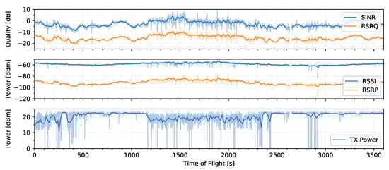 Figure 9 illustrates the main channel quality indicators of the published datasets to provide an estimate of the channel quality over time. The figure references the same data as the preceding comparison of Figure 8. The highlighted indicators were recorded and published for each of the previously described flights. The received power is again represented using the Received Signal Strength Indicator (RSSI) and the RSRP, whereas SINR and Reference Signal Received Quality (RSRQ) are used for signal quality description. Figure 9 underlines the observations from the previous distributions of Figure 8. The RSSI is defined as the total power the UE observes in the whole used frequency band. Therefore, it incorporates signal power as well as noise and interferences. In addition, the RSRP measurements reflect the average linear power of a single reference carrier. Thus, it provides an estimate of the strength of the usable signal of the network. As it does not include interferences and noise, it lies clearly below the RSSI measurements. In the underlying time-series, the difference is on average 32 dB. RSRP measurements locally range down to nearly −100 dBm. Assuming a typical UE receiver noise floor of −97 dBm [53] underlines the challenges of maritime air-to-ground communication. The upper subplot shows the signal quality in terms of RSRQ and SINR. Both show a strong correlation.