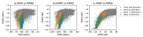In order to analyze correlations and model channel conditions more precisely, Figure 10 compares the RSRQ to (a) RSSI, (b) RSRP, and (c) SINR in the form of a scatter plot. Moreover, the ground-based measurements serve as a comparative reference to the in-flight measurements. The evaluations underline the bad value range of the channel quality indicators. For RSSI, the value range lies between dBm and −70 dBm. Data points lie on noisy lines, distinguishable by the used frequency. Even though the Pearson correlation coefficient (c.f. Table 2) ranges up to for LTE Band 3, a direct derivation of RSRQ based only on RSSI measurements is not possible. The scatter plot Figure 10b of RSRQ and RSRP reveals a linear correlation with the Pearson coefficient being above for all used frequency bands. Measurements of the reference signal power allow direct estimation of channel quality. This is contrary to the ground-based measurements, where nearly no correlation can be found, which is also confirmed by low correlation coefficients between 0.25 and 0.54. This is attributed to a lot of shadowing by buildings and obstacles, reflections, and multipath interferences, which occur during drive tests and perform a significant degradation of signal quality. In summary, this leads to the conclusion that interferences with other LTE users and fast fading effects are neglectable. Channel quality is therefore mainly determined by path loss.