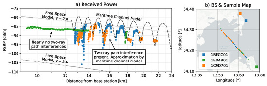 In the next step, the path loss effects are further investigated. To derive channel characteristics and evaluate signal attenuation, Figure 11 evaluates the received power in dependency of the distance between UE and the currently connected cell (eNB). The analysis leverages the received signal power (RSRP) of the three most frequently used eNBs in the 800 MHz frequency band (LTE Band 20). Different sectors of each eNB were consolidated in the evaluation as the according antennas are located at the same radio tower. The left subplot (a) illustrates the path loss and power, the right subplot (b) shows a map of the eNB locations and positions, where the RSRP samples were recorded. When discussing aerial communication, free space characteristics are usually assumed. Typically, there are no obstacles are between sender and receiver: the direct Line of Sight (LOS) assumption is valid. This aspect can be seen by the recorded RSRP samples of Cell Identifier (Cell ID) 1ED4B01 (green color). In the distance between 9 and 14 km, the signal strength decreases linearly with respect to the logarithmic distance. The free space path loss can be modeled using the Friis Transmission Equation [47] with the propagation coefficient . The propagation coefficient has a major impact on the path loss. For 1ED4B01 (green color), a propagation coefficient of holds true. An approximate Effective Isotropic Radiated Power (EIRP) of 30 dBm is estimated for the illustrated model. With increasing distance, the RSRP measurements diverge from the free space model and form uneven patterns even though the LOS condition is given. These effects can be explained using the maritime channel model (see previous work of the authors, where this model is discussed in detail [49,54]). In addition to the direct LOS path, the maritime channel model takes a secondary, ground-reflected Non-Line of Sight (NLOS) path into account. The superposition of multiple radio propagation paths leads to interferences causing the divergences from the free space path loss model. The illustrated maritime channel model in Figure 11 uses an estimated antenna height of 100 m and measured UAV altitude of 400 m. The model provides a good approximation of the measured RSRP. In the near field, the secondary NLOS path is blocked by ground-based obstacles (e.g., trees, buildings, etc.) and the maritime two-ray model does not apply. This can be seen in the map subplot especially for Cell ID 1ED4B01 (green). In the first 14 km, the NLOS is blocked and free space model applies.