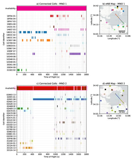 . The first column (subplots a,c) indicates the cell identifier to which the LTE modem of the UAV is currently connected to. The first five characters of the Cell ID represent the identifier of the eNB, the last two characters indicate different sectors or antennas of the same eNB. Within all figures, different antennas were grouped for each eNB and share the same colors. The upper row of the cell identifier plot shows the availability of the MNO. The availability represents whether the network was able to transport payload data. The detailed methodology for the determination of the availability will be discussed in detail in the subsequent section and Figure 13. Within Figure 12, the right column (b,d) shows a map of the locations of each eNB. The upper row (a,b) represents MNO 1 evaluations and the lower row (c,d) MNO 2 evaluations. During the first half hour of the flight, the UAV is connected to 21 different eNBs of MNO 1 and 25 eNBs of MNO 2. Throughout the flight, the UAV’s LTE modem performs 111 handovers between cells of those eNBs, which correspond to an average length of stay of 16.2 s per cell for MNO 1. For MNO 2, 166 cell changes were conducted leading to an even smaller duration of stay of 10.8 s. Handovers in LTE are either initiated by the or by the UE. However, the final handover decision remains at the core network and aims at maintaining and maximizing the user’s Quality of Service (QoS) (c.f. also resource allocation in next-generation broadband wireless access networks [55]). Here, it is once again obvious that the decisions are optimized for ground users: handovers are conducted between unsuitable cells, which leads to a back-and-forth switching between two cells. This effect can be seen, e.g., at MNO 1 between cells 1ECD901 (purple) and 1D8C801 (black) (at time of flight 1300 s–1700 s) or between cells 1A6CF03 (pink), 1BECC02 (blue), and 18F9A01 (red) (1000 s–1300 s). Typically, the decision policies use the UE’s measurement report, which indicates the quality of all cells the UE can see. In the underlying scenario, typically all cells have unfavorable channel conditions. For future work, we propose a mobility and maritime channel aware handover decision policy for UAVs. Hereby, handover decisions could be improved significantly. An additional optimization would be to disable frequency bands above 1 GHz. On a few occasions, the UEs were able to detect cells in LTE band 1 (2100 MHz) and band 7 (2600 MHz). Those cells typically have more bandwidth and most MNO aim at moving users there for improved load balancing. In the underlying maritime scenario, those handovers failed on a regular basis.