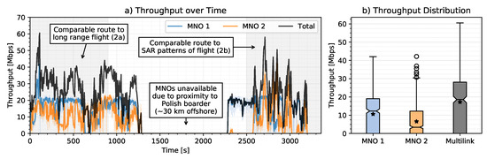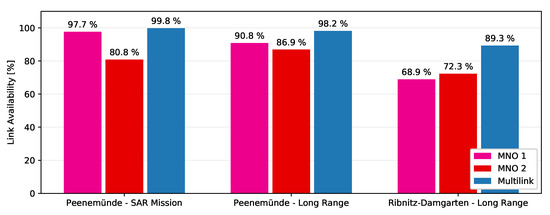 . The multi-link approach yields the highest availability in all scenarios. For Peenemünde SAR Mission, 99.8% availability was achieved, which is primarily because the mission was flown in the proximity of the shore, where MNO 1 had a good single link performance of 97.7%. Nevertheless, in the Peenemünde long-range scenario, the multi-link performed very well with a similar score of 98.2%. Here, the single link availability of 90.8% of MNO 1 was lower than in the previous flight. In the Ribnitz-Damgarten scenario, both MNO’s single link performances were significantly lower than in the Peenemünde scenarios. This is due to the fact that the Ribnitz-Damgarten site is more rural and less populated and contains fewer surrounding LTE coverage. Nevertheless, the multi-link approach results in the highest availability of 89.3%, which is an increase of 20% for MNO 1 and 17% for MNO 2. In conclusion, it can be stated that the multi-link approach increases the availability in all scenarios.