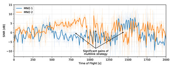 . The figure shows a time series of the SINR signal quality over time for both MNOs. Raw samples are plotted in the background, the bold lines show a post-processed moving average of 10 s. As discussed previously, SINR values below 0 dB indicate the worst channel conditions. However, the plot shows that most of the time when one MNO suffers from bad channel quality, the other operator is able to assist. This effect can be seen for a long duration of several minutes, e.g., during a time of flight between 500 s and 900 s. In general, one can say that the more heterogeneous the links are, the more gain the multi-link approach yields.