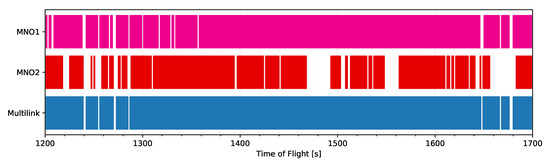 Figure 15 shows a time-series example of the link availability evaluation taken from the Peenemünde long-range flight. The first two rows represent two public German MNOs, the bottom row features the resulting multi-link. Whenever the bars are colored, the communication link is available. White gaps indicate that no connectivity and no data can be transmitted. Shorter gaps are typically caused by non-beneficial handovers between different cells and last only a few seconds. Larger gaps originate from network unavailability and bad channel conditions.