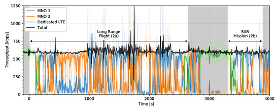 . The throughput was recorded at the UAV using the open source software Bandwidth Monitor NG (bwm-ng), which captures the data rates for each interface. Throughout the experiment, the MPTCP scheduler “Lowest Round-Trip-Time First (LRF)” was used. The plot shows the data rates for the public MNOs 1 and 2 as well as for a local dedicated LTE network and the total payload data rate. The bold lines represent a rolling mean of 5 s of the raw samples (thin lines). The dedicated LTE is a small cell solution located at the airport to allow easy maintenance when the UAV is at the airport, where public MNO coverage is not always available—especially in shadowing of buildings. Due to the transparent nature of MPTCP, in the future, this LTE small cell can be replaced by a full long-range LTE solution, which could assist as a third aerial data link. During the experiments, a video stream with an approximate data rate of 500 kbps as well as telemetry and control messages with approx. 100 kbps (including the previously described ICMP packets) were transmitted. The plot illustrates the smooth handover between the data links, which is enabled by MPTCP. When one link is unavailable, data is outsourced on the other link.