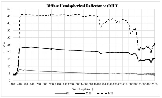 Laboratory-measured diffuse hemispherical reflectance (DHR) from 300–2500 nm for the 6%, 22%, and the 44% calibration reference panels.