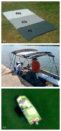 Constructed calibration targets deployed on land during North Farm experiments (a) and on a boat canopy during Lower Pearl River missions (b). Tie downs are loosened during flights in the Lower Pearl River study area to allow the calibration reference panels to lie orthogonal to unmanned aerial systems (UAS) when deployed on top of boat canopy (c). The darkest panel is 6% reflectance, the medium panel is 22% reflectance, and the lightest panel is 44% reflectance.