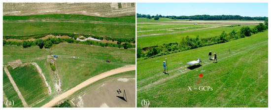 (a) R. R. Foil Plant Science Research Center (North Farm) study area on the campus of Mississippi State University. (b) View of the North Farm 2.0 research site configuration where Xs represent the eight ground control points (GCPs).
