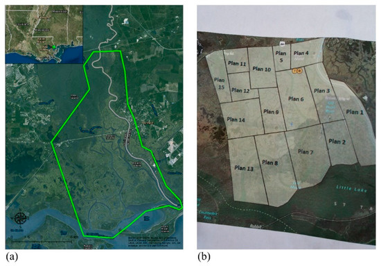 (a) Lower Pearl River Estuary study area and (b) image of the flight plans conducted during the August 2015 mission. Flight lines were determined on a per-flight basis to account for wind conditions to optimize flight time; long flight lines were typically preferred. For example, Plan 8 would typically fly in a north-northwest to south-southeast flight line orientation.