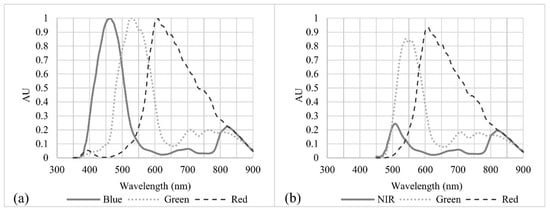 The original camera collected data from 300–1000 nm (Figure 6a); however, the sensor was retrofitted with a Wratten #12 yellow filter that blocks wavelengths less than 450 nm (Figure 6b). The purpose of this filter was to convert the blue sensor to a surrogate near-infrared (NIR) sensor. By limiting the response to blue visible wavelengths, the camera was converted to a green-red-NIR colour-infrared (CIR) camera; however, the resulting NIR spectral band had a rather noisy and weak signature.