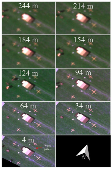 Example MicaSense RedEdge true color composite images from each flight altitude during the North Farm experiments. During image collection, the UAS heading stayed fixed facing toward the north. A minimum of 30 images were collected at seven viewing angles, one set at nadir then six additional sets while hovering over numbered wood panels distributed evenly around the tarp.