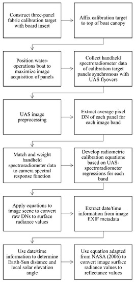 Missions lasted four to six days and imagery was collected between 08:00–16:00 LT with four to five flights per day producing eight to fifteen image acquisition instances of the calibration target per day (32–90 per mission). Regular operations involved two boats, one dedicated to flight operations and the other dedicated to water operations. The flight operations boat was tasked with the flight of the UAS and the download and storage of flight data. The water operations boat worked with the flight operations boat so that in-situ water quality information was collected each time the UAS flew directly overhead the water operations boat. The water operations boat also carried the calibration reference panels and the handheld spectroradiometer. Ground reference data of the calibration reference panels were collected in synchrony with UAS flyovers of the water operations boat using a GER 1500 spectroradiometer (Spectravista Inc., Poughkeepsie, NY, USA). Three GER 1500 spectroradiometer hyperspectral samples of each calibration reference panel were collected and averaged to produce an average spectral signature for each grey value. The workflow from field operations to the final image calibration is summarized in Figure 8.