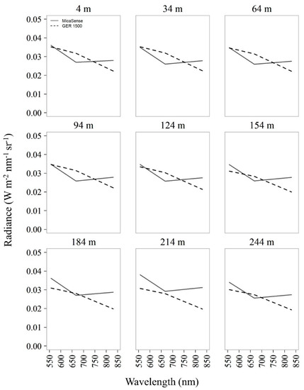 From the NF2 experiment, it was clear that an ELM radiometric calibration would be required for the Lower Pearl River UAS imagery. This is illustrated by comparing the GER 1500 ground spectroradiometer radiance values with the airborne green, red, and NIR MicaSense radiance values at each flight altitude (Figure 9). There was an important and clear increasing trend in atmospheric contributions to the UAS imagery, especially at flight altitudes higher than 124 m. Compared to the ground-based spectroradiometer radiance values, the MicaSense green and NIR radiance values returned greater signal to the imager at all flight altitudes. The MicaSense red band did not show radiance values as high as green and NIR bands because this specific band had a lower spectral response than is shown in the spectral response function from the manufacturer in Figure 4, indicating that it needs calibration. This points to the fact that coefficients derived in the lab and applied to this imagery in Equation (1) may not perform with the same accuracy in the field [57]. Nevertheless, the consistently higher radiance in the green band with increased altitude confirms that the imagery was impacted by atmospheric contributions. In addition to atmospheric scattering, there were challenges in obtaining representative spectral information from the 22% and 44% calibration reference panels because of saturated pixels (i.e., DN values >=65,520). This oversaturation was caused by the automated MicaSense exposure and ISO settings and it reduced the effectiveness of the prescribed MicaSense radiometric calibration procedures. Overall, the outcomes from the North Farm experiment suggested that an ELM radiometric calibration was required prior to obtaining biophysical information from the Lower Pearl River UAS imagery in order to develop new calibration coefficients to adjust for: (1) errors emanating from applying lab-derived coefficients to field imagery, (2) changes in sensor spectral response that occur after laboratory calibrations, and (3) atmospheric contributions to the imagery.