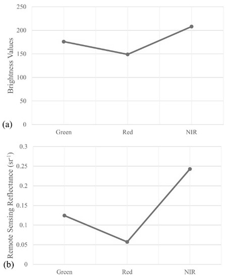 To further illustrate the performance of the presented ELM radiometric calibration framework, 2000 vegetation pixels were randomly selected and their median spectral response was plotted for the August 2015 mission imagery (Figure 11). Healthy vegetation should return a much stronger NIR signal than green and red. However, the brightness values in green and red bands were quite high, as observed in Figure 11a. These high values in the green and red bands are due to atmospheric contributions to the imagery and errors emanating from inherent differences in the spectral responses of the sensor bands (as shown in Figure 6). After applying the calibration equations, the green and red signals decreased resulting in a typical vegetation spectral response. The further dividing of solar irradiance to obtain remote sensing reflectance helped to minimize additional error due to variations in solar conditions throughout the image collection period (Figure 11b). A unique aspect of the proposed framework is this separation of radiance calibration and normalization of solar irradiance which allowed for the correction of any imagery collected with the same Canon DSLR camera independent from the time of collection; therefore, this framework also allows for the application of the calibration equations to imagery collected at a different time.