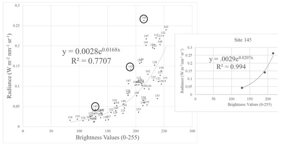 The flight altitudes of small UAS (sUAS) typically do not exceed 250 m due to governmental restrictions on UAS operations [34]. As a result, numerous UAS studies have implemented an empirical line method (ELM) for radiometric calibration of UAS imagery [35,36,37,38,39,40,41,42,43,44,45,46,47]. The foundation of an ELM is the regression of ground-based spectroradiometer measurements and airborne remotely sensed measurements of a spectrally stable calibration target to develop calibration equations that convert image digital numbers (DNs) to physical at-surface reflectance units [48]. Due to the nonlinearity observed between consumer-grade digital cameras and surface reflectance [44], UAS radiometric calibrations may require more than two calibration targets to be present in the imagery to address any nonlinearity of the sensor [4]. For example, using nine near-Lambertian calibration targets, Wang and Myint [40] found an exponential relationship between their consumer-grade sensor-recorded digital numbers (DNs) and ground-based spectroradiometer reflectance. Following the simplified ELM radiometric calibration framework recommended by Wang and Myint [40], Mafanya et al. [45] found that using a calibration target with six grey levels could quantify this nonlinear relationship and produced an accurate image calibration.