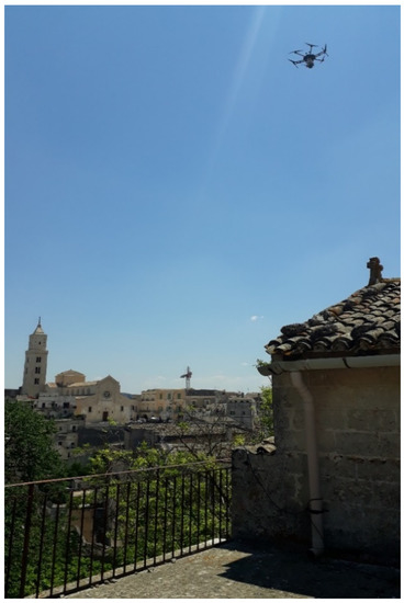 In this scenario, the challenge was to recognize people and objects by maintaining the drone in the worst flight conditions, at an altitude of 40 m over the roof of a church (see Figure 3 and Figure 4). The drone was required to never fly directly over the people while facing strong wind blowing at 35–38 km/h and using the zoom in order to capture better images of the subjects. In these conditions, the drone was swinging considerably.