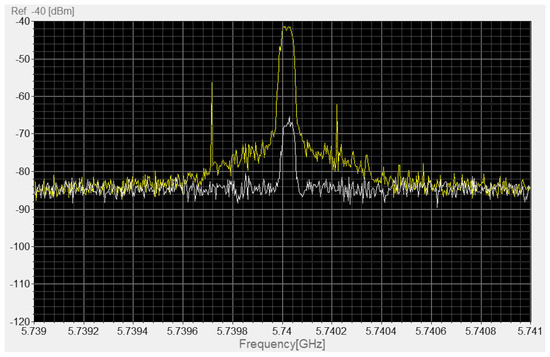 Besides the spectral analysis, the system was used to estimate the direction of arrival of the jammer signal. Thanks to the direction-dependent response of the onboard antenna, a rotation of the drone around its vertical axis produces a significant variation on the detected signal. Figure 7 shows two spectra acquired in the presence of the jammer with the drone facing the malicious device (yellow curve) and the opposite direction (gray curve). The jamming signal at 5.74 GHz is visible in both cases, with a level of about −42 dBm and −67 dBm, respectively. An increase of about 25 dB in the received signal has been observed when the drone/antenna tip was oriented toward the direction of the jammer.