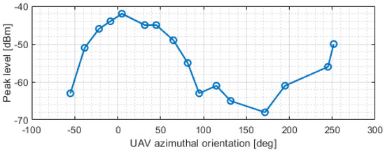 Figure 8 shows the measured signal level of 16 spectra acquired during an azimuthal rotation of the UAV from −50 degs to 250 degs. Even if localized oscillations produced by occasional wind gusts are present, the maximum and minimum signal levels can be observed at about 0 degs and 180 degs, respectively.
