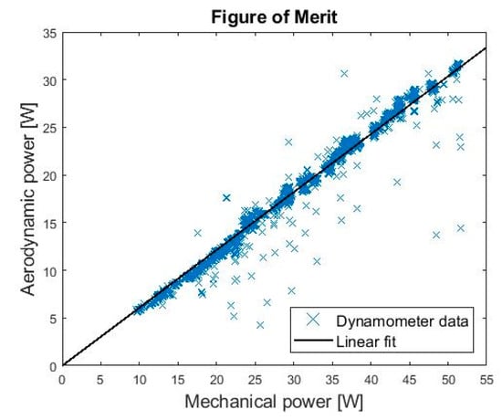 Plot of aerodynamic power over mechanical power. The slope of the linear fit is the Figure of Merit (FoM).