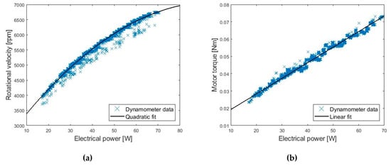 (a) Rotational velocity over electrical power with a quadratic fit laid to the measurements. (b) Torque over electrical power a linear fit laid to the measurements.