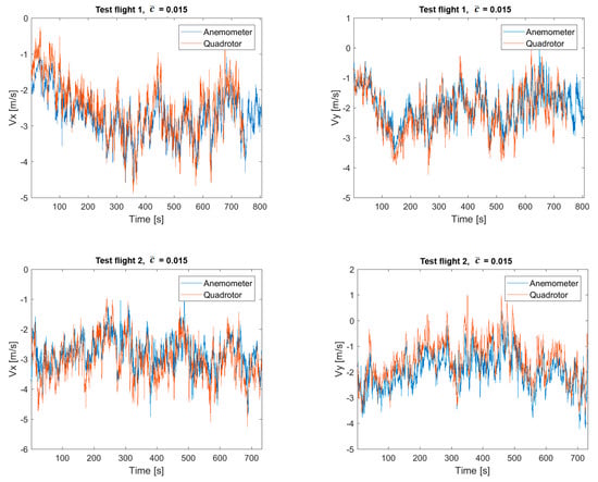 Flight tests were conducted in Ramfjordmoen, a larger valley not far from Tromsø, Norway, on 27 April 2018. During each flight, the quadrotor was holding its position in Loiter mode until the battery’s charge was depleted (for about 8 minutes) at a horizontal distance of about 2 m from the anemometer and an altitude of about 3 m above ground. Care was taken to ensure that the quadrotor was not positioned in front of the anemometer, as seen by the wind, which was coming from a north-eastern direction. The used anemometer is intended to measure two horizontal components of wind velocity. Therefore, the validity of the wind estimates could only be verified in the horizontal and direction, even though the proposed method gives a three-dimensional wind estimate.