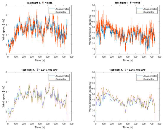 To quantify the results, they were transformed to polar coordinates and root mean square errors (RMSEs) were calculated for wind speed and wind direction, which are listed in Table 4. This was done both for the results binned in 0.5 s intervals, as well as after the application of a 10 s moving average filter (MAF). Figure 6 shows the results of one of the flights transformed to polar coordinates with and without the application of the 10 s MAF.