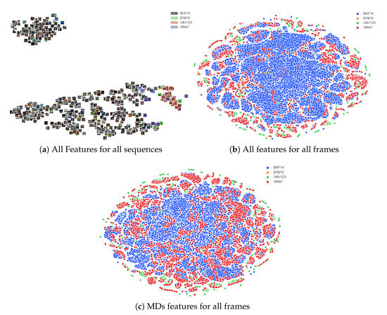All results follow similar tendencies over all tested parameters. They are described and illustrated in Figure 2 with perplexity 30. In Figure 2a, we added the thumbnails of the first frame of sequences for more readability. Colors were attributed to the points, or to the thumbnails, depending on the dataset that elements are originating from. In Figure 2a, we can observe the spread of HSMs in the space, per sequence and considering all features. We note that UAV videos (colored) are located moderately apart from conventional videos, especially these coming from UAV123 (red) and DTB70 (green). Furthermore, most of UAV VIRAT videos (blue) are closer to typical sequences than other UAV content. These sequences are possibly sharing saliency characteristics with certain conventional videos. This fact supports previous claims, in that the majority of VIRAT HSMs present a center bias. It is also striking that traditional videos are separated into two large clusters. This could be further explored, though not in this paper as it would get out of the scope of our study.