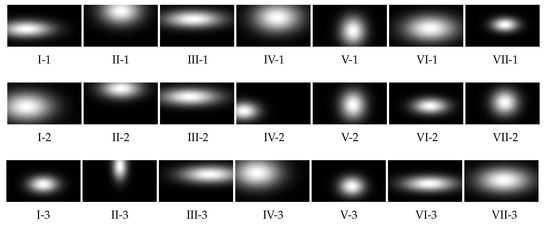 The idea of extracting biases roots in the prevalence of a center bias in generic audiovisual stimuli salience. The center bias is often represented by a centered isotropic Gaussian stretched to the video frame aspect ratio [6,7]. Here, we get free from the isotropic and centered characteristics of the Gaussian. Moreover, the stretching may not apply to UAV contents, which, for instance, often present smaller size objects. Under these considerations, biases are to be parameterized by a set of two mean and standard deviation parameters, representing the Gaussian center and spreading, respectively. Such 1D-Gaussian parameters are derived from MDs of the ground truth human saliency maps. That is, we compute mean and std values of the marginal distributions, horizontally and vertically, for each HSM frame of each sequence, i.e., , , , and , respectively. We will refer to these values as MDs statistics, to make the difference with MDs features.