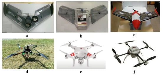 Views of the some utilized drones in surface mining (a) Teklite [], (b) GoSurv [], (c) Swamp Fox [], (d) Quadcopter [], (e) Phantom 2 Vision+ [], (f) Aeryon Scout [].