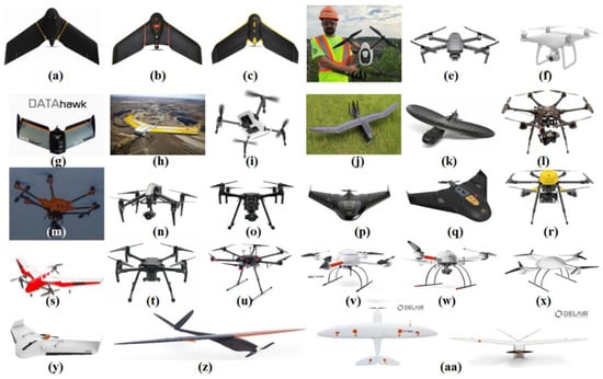 Views of the commercialized drones for surface mining applications; (a) eBee-X [], (b) eBeeSQ [], (c) eBee-Classic [], (d) Kespry 2s [], (e) DJI Mavic 2 [], (f) DJI Phantom 4 Pro [], (g) DATAhawk [], (h) Q-200 Surveyor [], (i) Explore-1 [], (j) Leviathan [], (k) Maveric [], (l) Hex [], (m) Yuneec 3DR H520-G [], (n) DJI Inspire 2 [], (o) DJI Matrice 200 [], (p) UX5 HP – Trimble [], (q) UX5-Trimble [], (r) ZX5-Trimble [], (s) FIREFLY6 PRO [], (t) DJI MATRICE 210 [], (u) MATRICE 600 PRO [], (v) md4–200 [], (w) md4–1000 [], (x) md4–3000 [], (y) UX11 [], (z) DT18 HD [], (aa) DT26X LiDAR [].