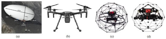 Commonly used drones in underground mines (a) Zeppelin [], (b) DJI M210 [], (c) ELIOS 1 [], (d) ELIOS 2 [].