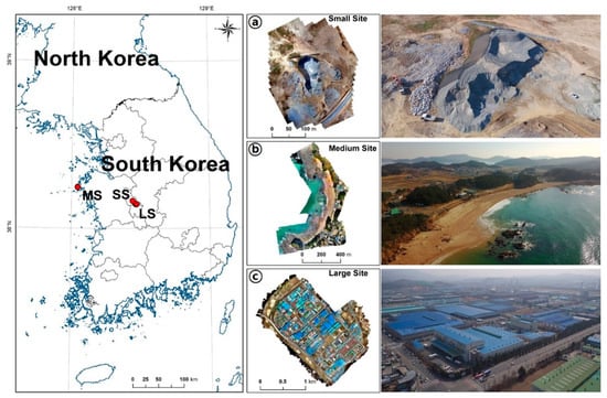 Figure 1. From left to right, a map of the Korean peninsula showing the locations of the three different study sites for (a) the small site, (b) medium site, and (c) large site, aerial orthomosaics of the three labeled study sites, next to images captured of the study sites from UAV.