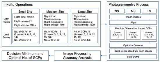 The research method can be divided into in situ operations, including UAV flights, image acquisition, and land survey; the photogrammetry process, where results are produced according to the number of GCPs; and accuracy analysis (Figure 2).