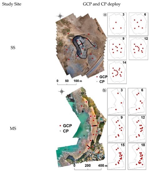 Thus, in typical areas (such as SS and MS), using 12 GCPs will be able to produce highly accurate 3D point clouds and DSMs. In larger areas, the installation of more than 12 GCPs will be required depending on the needs. These results indicate that using too many GCPs may not be effective compared to the labor and cost [55,56], even if the area of the target site is diverse, unlike calculating the optimal number of GCPs per area in previous studies [26,29,41,43].